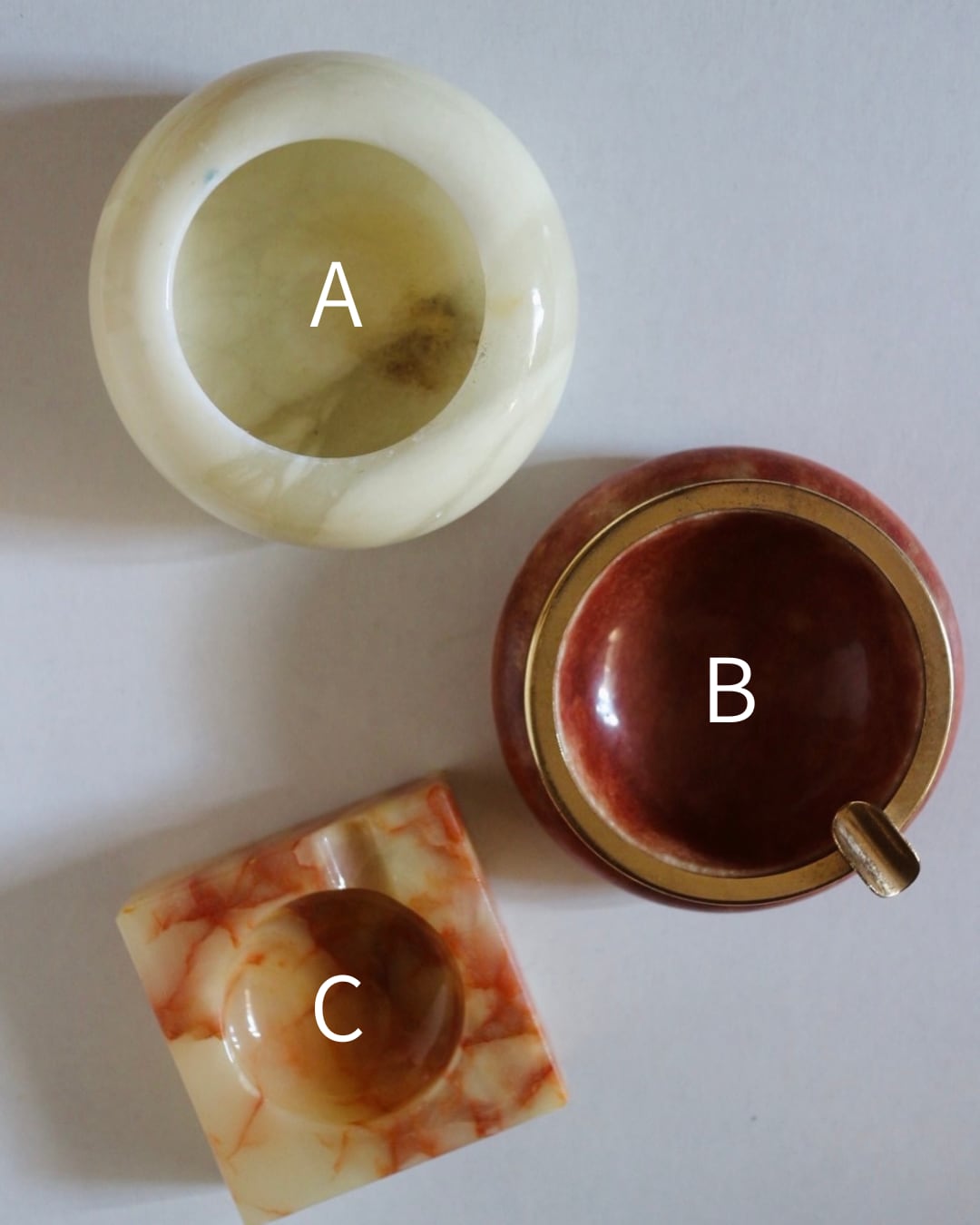 (B)直径 約9cm、高さ 約4cm、底直径 約6.2cm、金具部分:真鍮製
