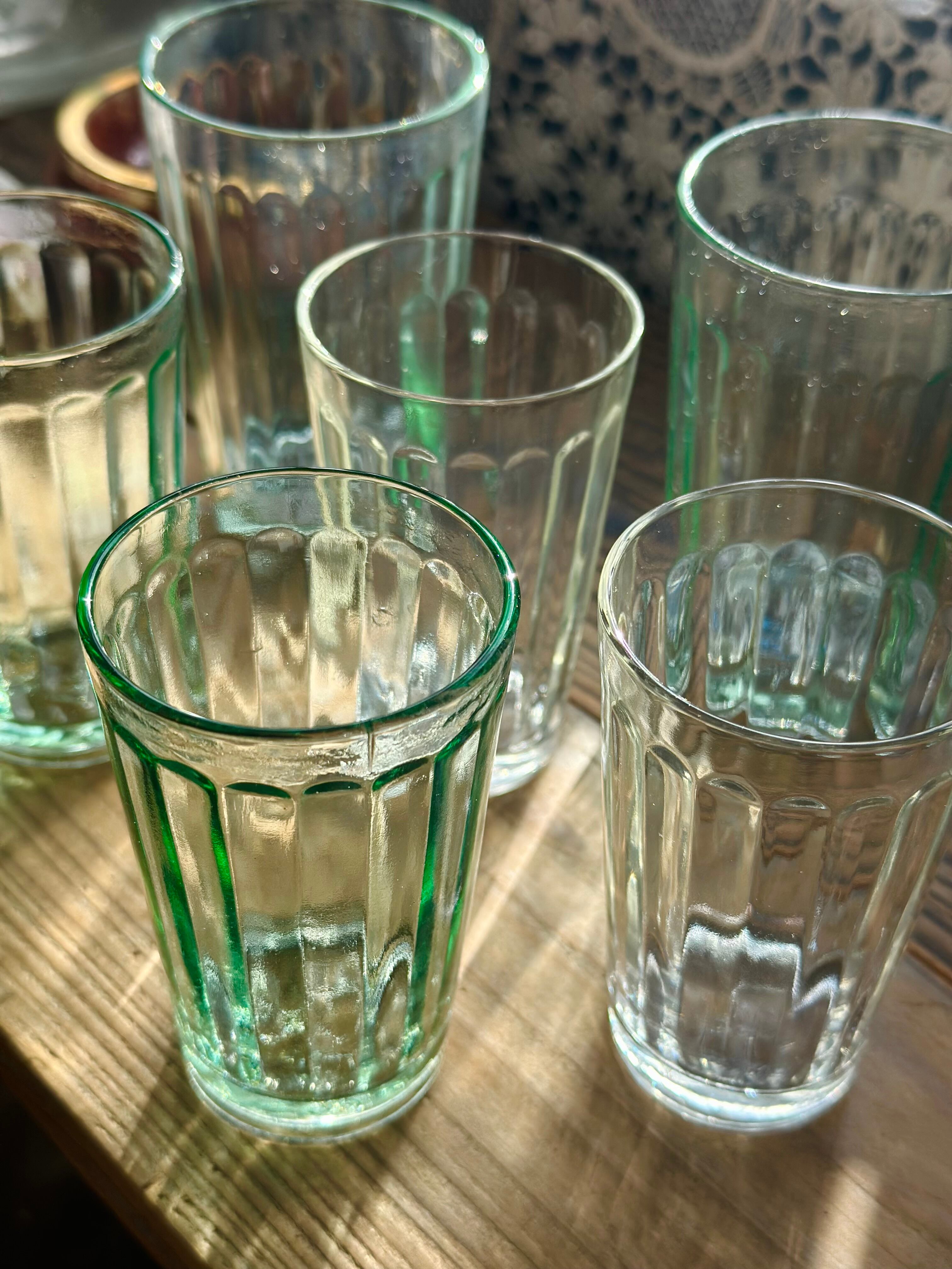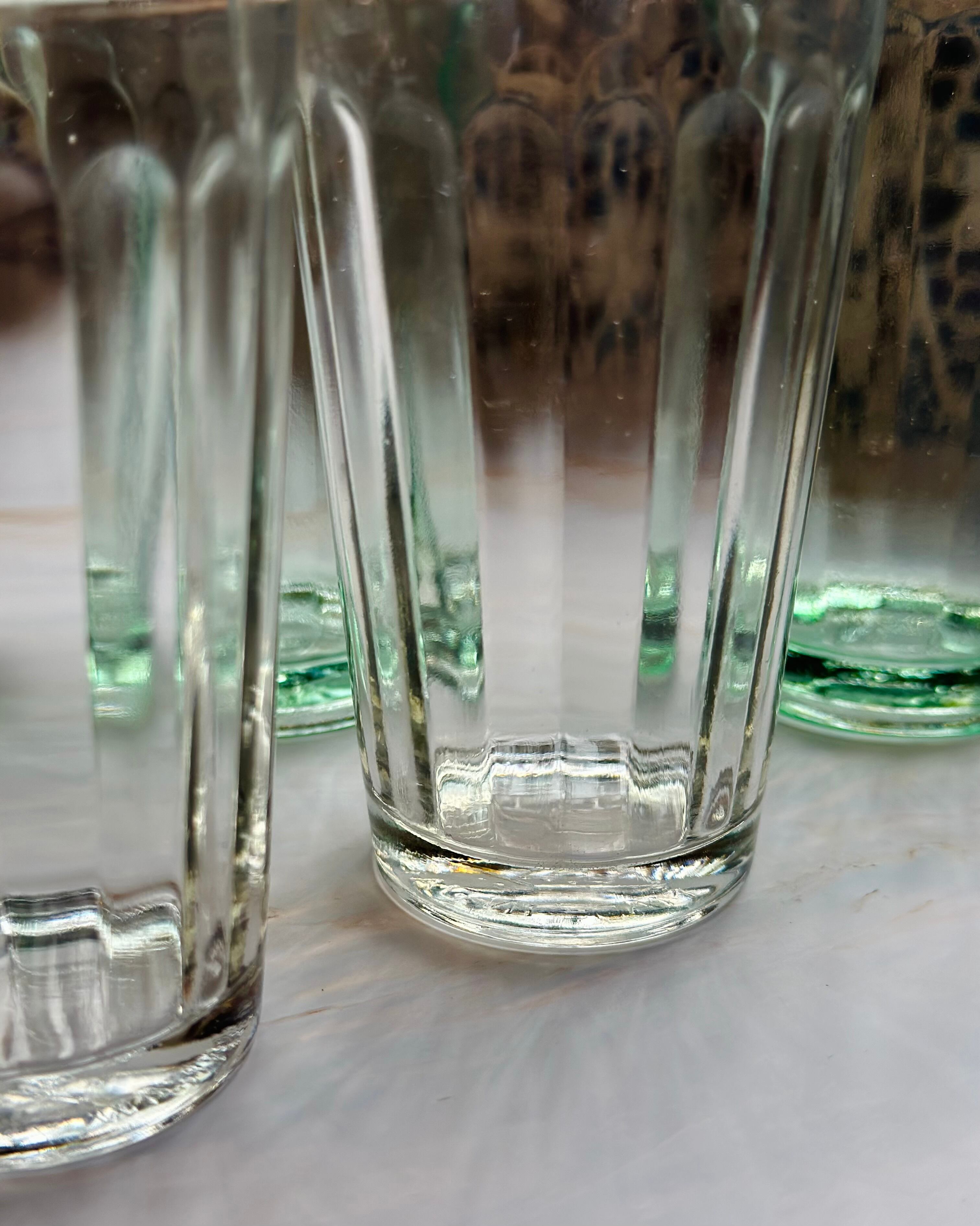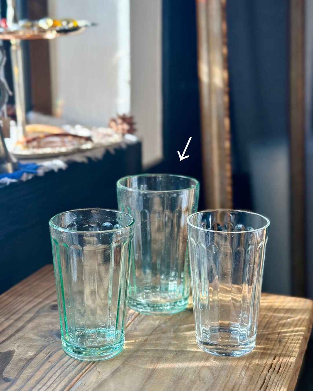 透明感のある淡いブルーグリーンの色合いと、製造時に混入した細やかな気泡や揺らぎが味わい深いです。