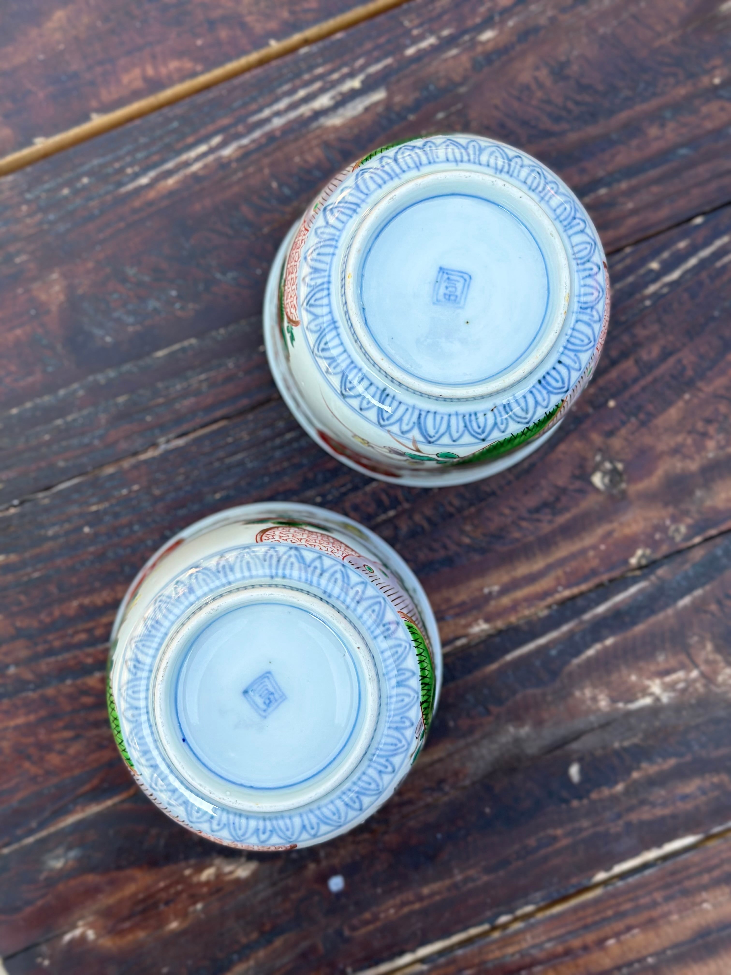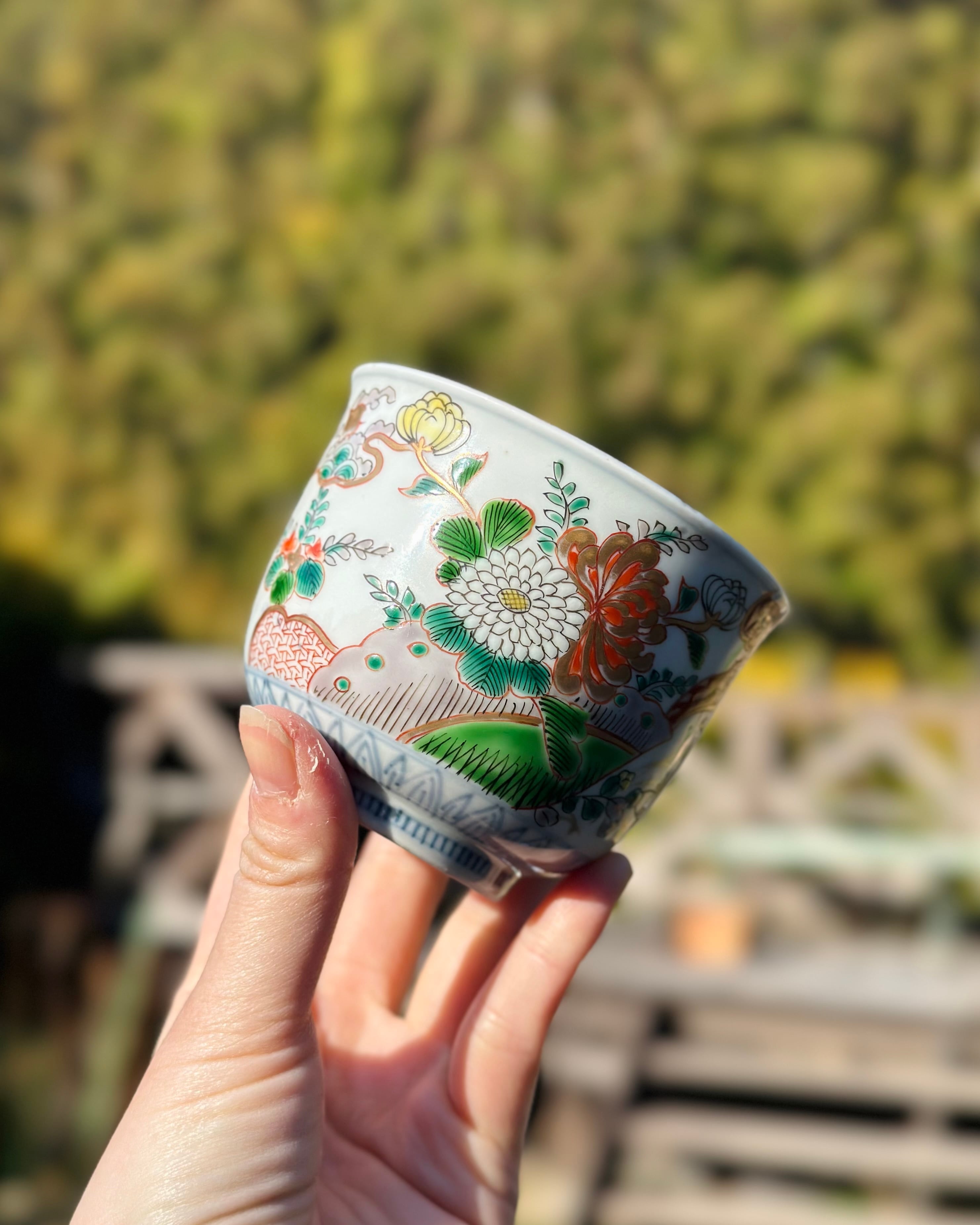 きらびやかで躍動感のある色絵花鳥文が施された蕎麦猪口です。状態良好でとても美しいです。
