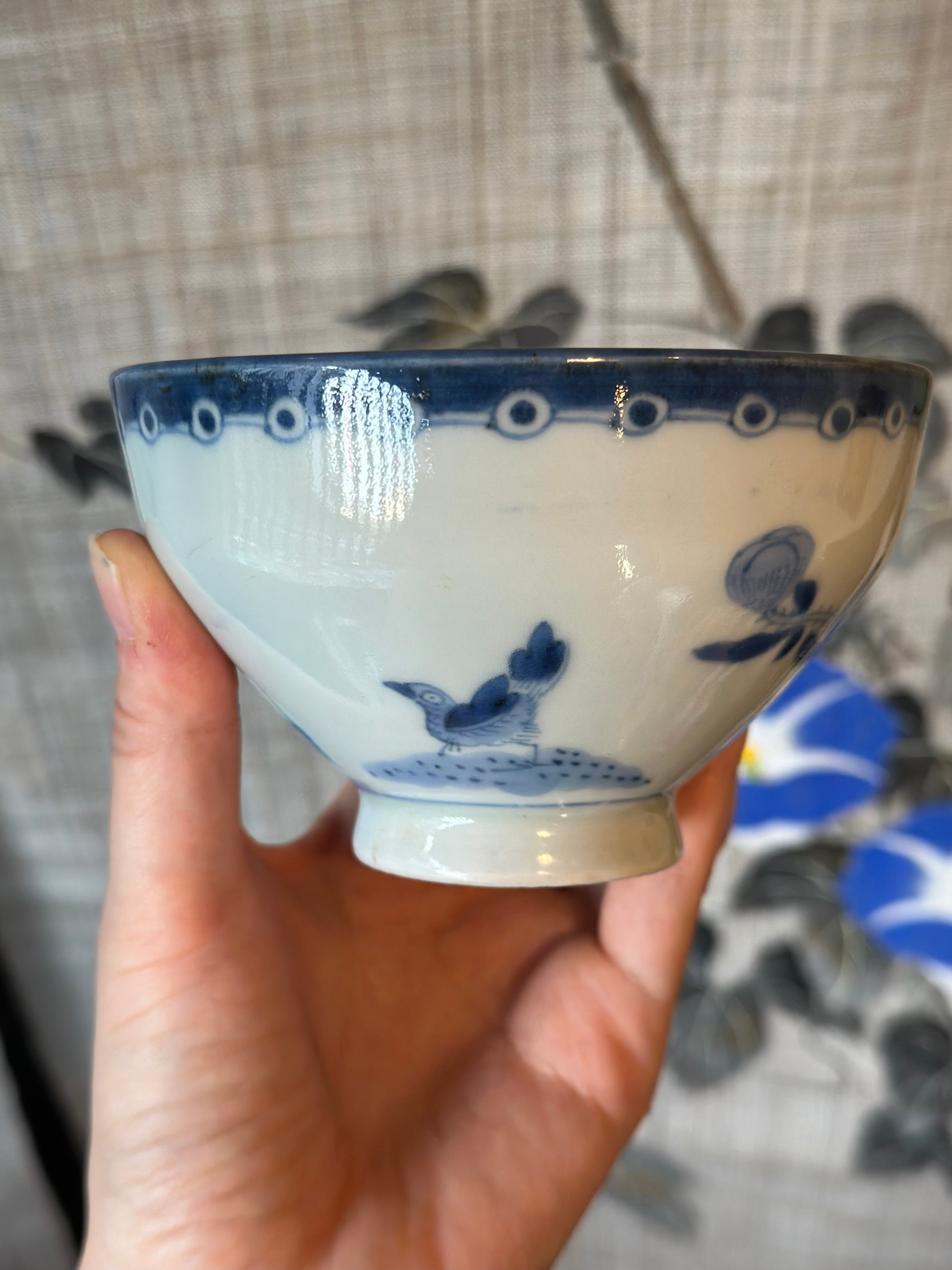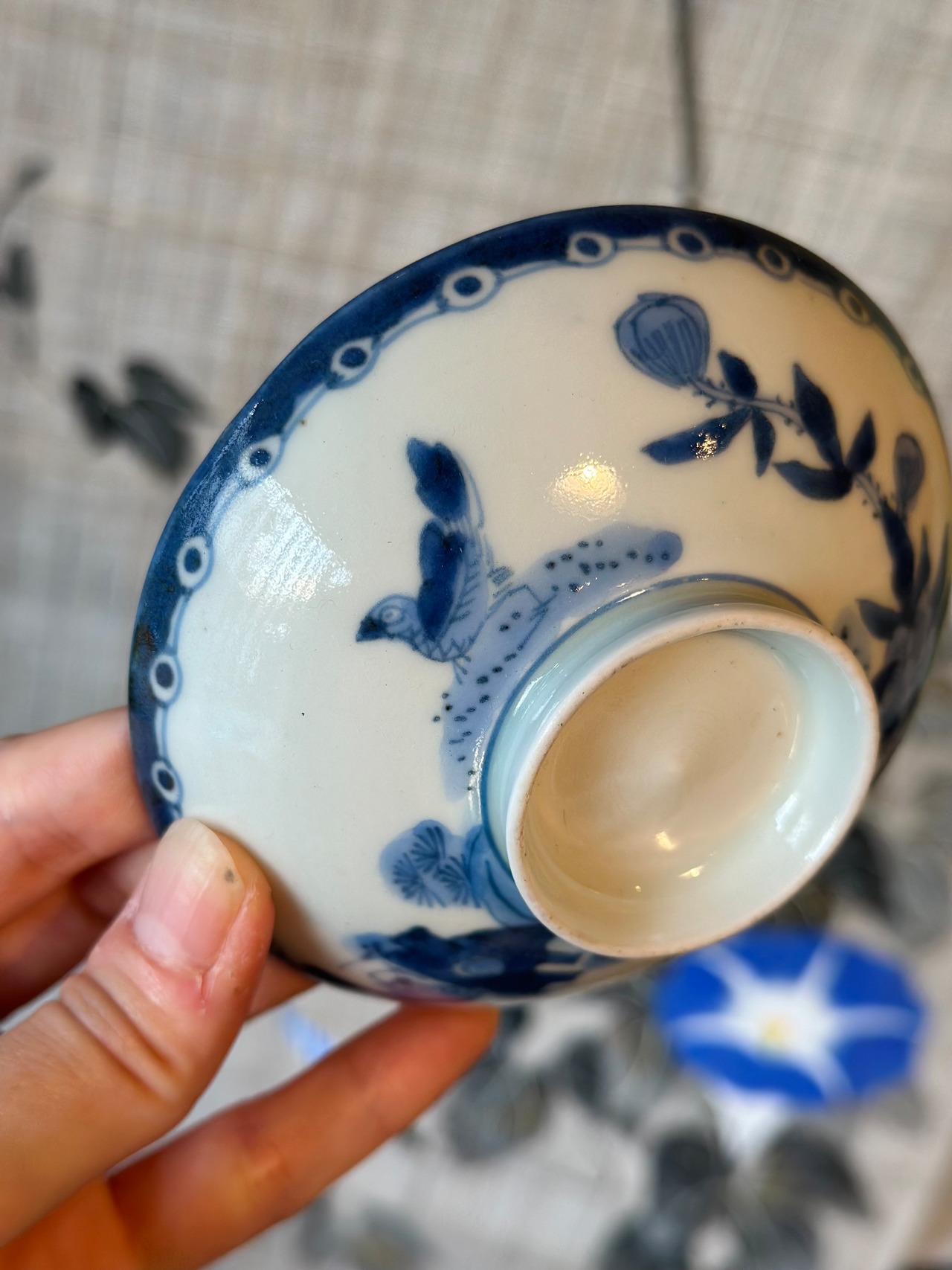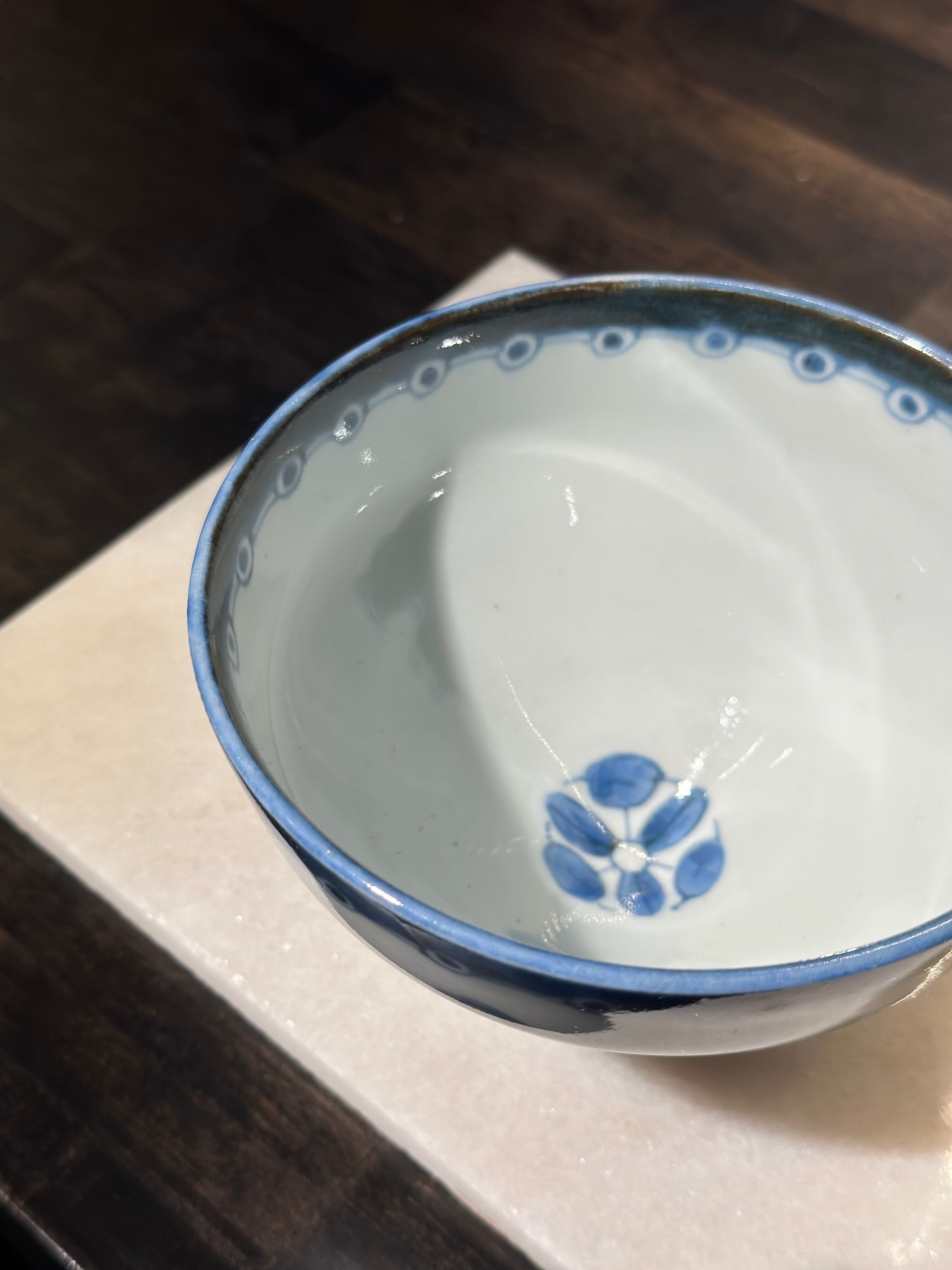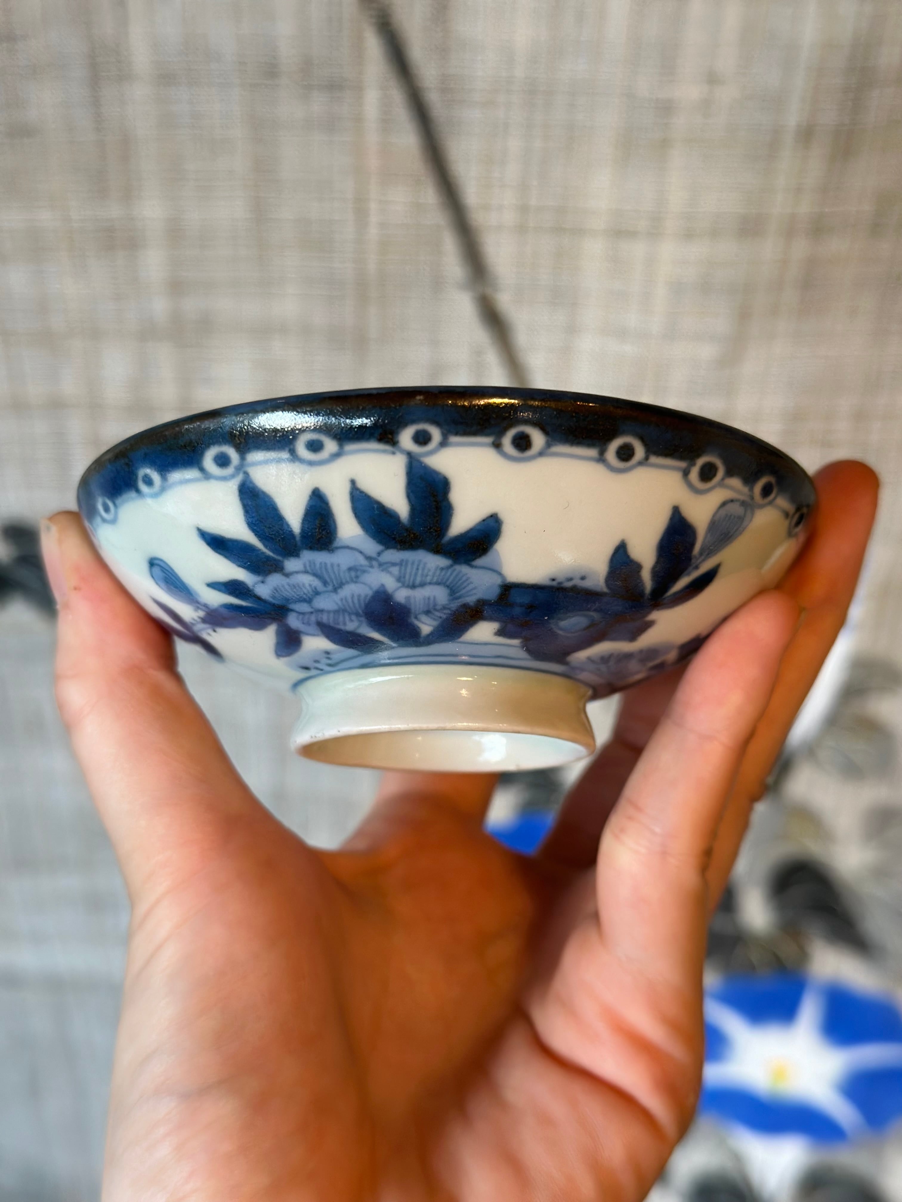 花鳥紋の染付が美しい藍九谷の飯茶碗5客揃です。